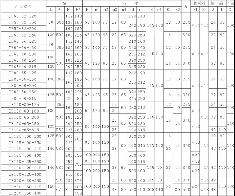 IH型不銹鋼化工泵性能參數(shù)表