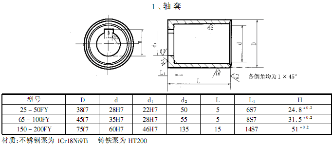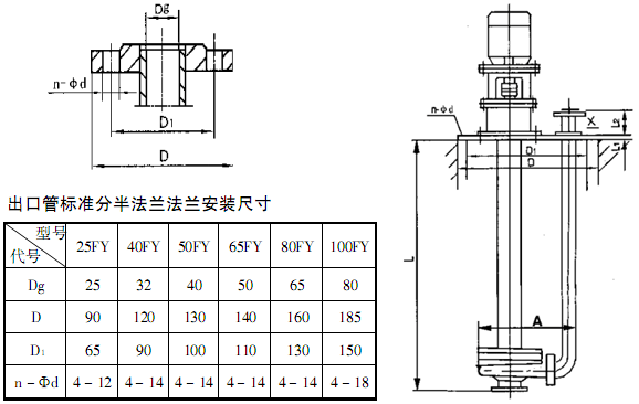 此外,F(xiàn)Y型耐腐蝕液下離心泵系列,因伸入容器長(zhǎng)度L的長(zhǎng)短不同,則又分為中間導(dǎo)軸承之結(jié)構(gòu)和無中間導(dǎo)軸承的結(jié)構(gòu)。