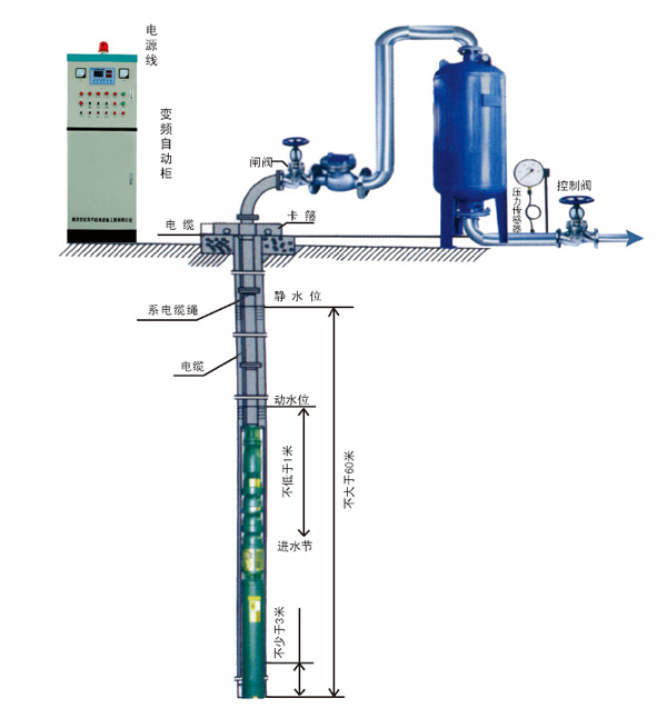 2、深井無塔變頻供水設備對井管、揚水管無特殊要求(即:鋼管井、灰管井、土井等均可使用;在壓力許可下、鋼管、膠管、塑料管等均可作揚水管使用)。