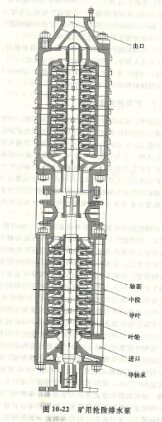 礦用搶險泵的主要特點是流量大、揚程高、功率大、機組重、尺寸大,其中又以揚程高為主要的特征。因為揚程高,泵必須采用很多葉輪的多級離心泵形式。很多葉輪分上下兩組,兩組葉輪相向?qū)ΨQ布置。每組中的葉輪及其對應的導葉套裝在主軸上并對應壓入中段內(nèi),導葉位于葉輪與中段之間,導葉與中段固定連接,葉輪與主軸采用鍵連接,多個中段及集水段均套裝在主軸上。壓裝有上組葉輪的中段,集水段及壓裝有下組葉輪的中段經(jīng)拉緊螺栓連為一體,中間集水段位于上組葉輪的出口位置,反導葉套裝在主軸上且位于下組葉輪的進口位置。該潛水泵由于兩組葉輪采用相向?qū)ΨQ布置,機組運行時產(chǎn)生的軸向水推力大小相等,方向相反,總的軸向力為零,延長了機組使用壽命,運行安全可靠。該泵的組合方式又分為雙吸和單吸兩種,雙吸泵的流量比單吸泵的流量大一倍而且可以自動平衡軸向推力列如大流量潛水泵;單吸泵在葉輪相向?qū)ΨQ布置的情況下也能基本平衡軸向推力,但加裝的單個葉輪必須是平衡葉輪,兩種形式均基本解決了軸向推力的平衡問題。水泵基本上不給電動機摧力軸承軸向負荷,對延長泵機使用壽命和保持性能穩(wěn)定十分重要。圖10 -22所示為單吸泵類型,該泵有很多徑向軸承,作用到徑向軸承上的力,一般由機械和液壓不平衡以及軸承縫隙所引起的偏心所造成。軸承由水潤滑,潤滑軸承的水通過壓力差來保持循環(huán)。軸承用錫青銅制成,軸承與軸徑之間保證足夠的間隙。