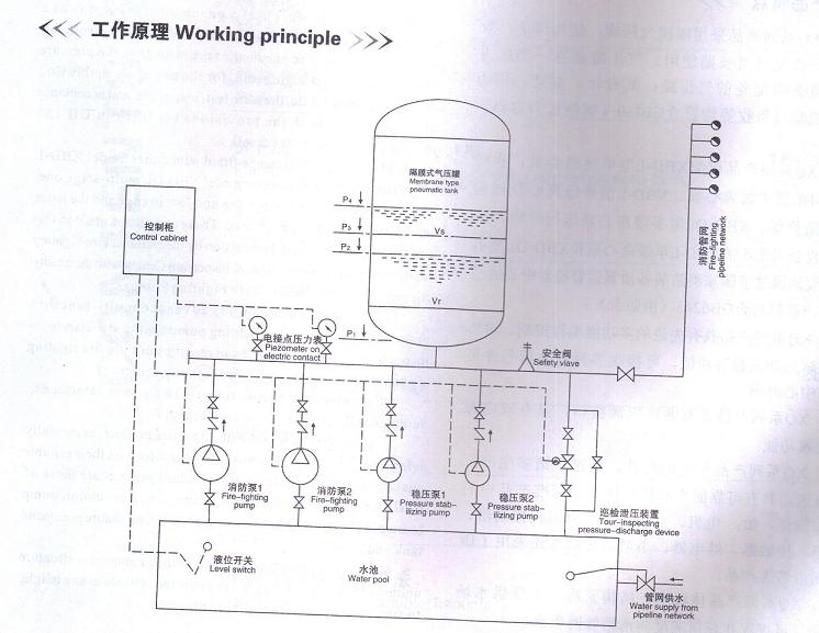 該設(shè)備采用囊式(隔膜)氣壓給水,當(dāng)穩(wěn)壓水泵處于低壓工作壓力P3時,由壓力繼電器傳感信號通過電控箱自動啟動水泵向罐內(nèi)補水,且同時增壓,當(dāng)壓力達到高工作壓力P4時,穩(wěn)壓水泵自動停止,此時的系統(tǒng)壓力在低工作壓力P3和高工作壓力P4之間變化。