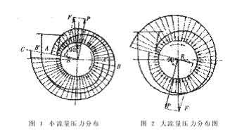 (2)當(dāng)流量小于設(shè)計(jì)工況流量時(shí),可從圖1看出,由于撞擊而產(chǎn)生的徑向力 P 的方向應(yīng)當(dāng)指向離隔舌,并向渦殼中液流的同方向轉(zhuǎn) 90°的方向,這一點(diǎn)極易證明。圖1上沿圓周壓強(qiáng)分布線 ABC 是一條上升值與角度成正比的螺旋線。在離隔舌180°的地方開始,做一條與之相同的螺旋線 A′B′,則把隔舌從 180°到 360°之間的壓強(qiáng)分成兩段,即與AB 完全一樣的 A′B 部分和 A′BCB′ 部分。AB 部分引起的徑向力與 A′B′ 部分引起的徑向力正好抵消,而 A′BCB′的剩余壓強(qiáng)大小均相等。因此,徑向力 P 的方向應(yīng)當(dāng)向上,即指向離隔舌90°的方向。同樣,當(dāng)流量大于設(shè)計(jì)流量時(shí),這部分的徑向力 P 應(yīng)當(dāng)是指向下方,即指向從隔舌開始 270°的地方。這就是徑向力產(chǎn)生的主要原因。
