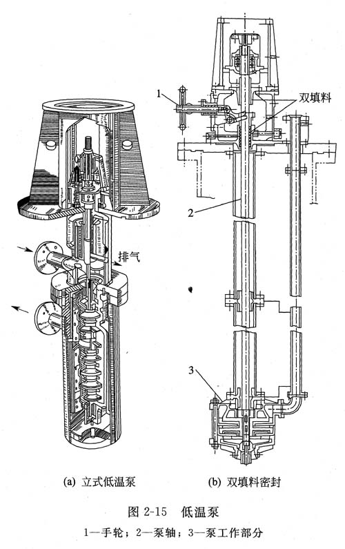 ③低溫泵 圖2-1 5所示為低溫泵的一種形式。這類泵一般用于輸送液化氣體,低溫