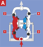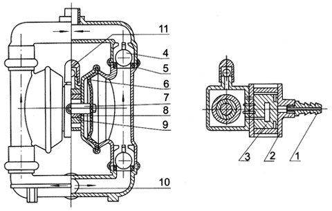 在氣動鋁合金隔膜泵的兩個對稱工作腔中,各裝有一塊有彈性的隔膜6,聯(lián)桿將兩塊隔膜結(jié)成一體,壓縮空氣從泵的進氣接頭1進入配氣閥 3后,推動兩個工作腔內(nèi)的隔膜,驅(qū)使聯(lián)桿聯(lián)接的兩塊隔膜同步運動。與此同時,另一工作腔中的氣體則從隔膜的背后排出泵外。一旦到達行程終點。配氣機構(gòu)則自動地將壓縮空氣引入另一個工作腔,推動隔膜朝相反方向運動,這樣就形成了兩個隔膜的同步往復(fù)運動。每個工作腔中設(shè)置有兩個單向球閥4,隔膜的往復(fù)運動,造成工作腔內(nèi)容積的改變,迫使兩個單向球閥交替地開啟和關(guān)閉,從而將液體連續(xù)地吸入和排出