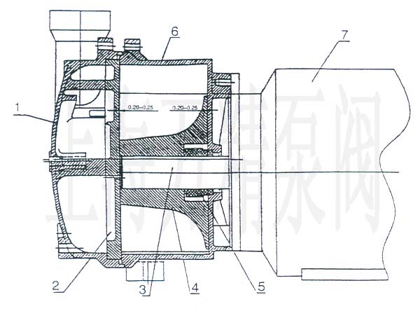 1.泵蓋 2.園盤 3.平鍵 4.葉輪 5.機械密封 6.泵體 7.電動機