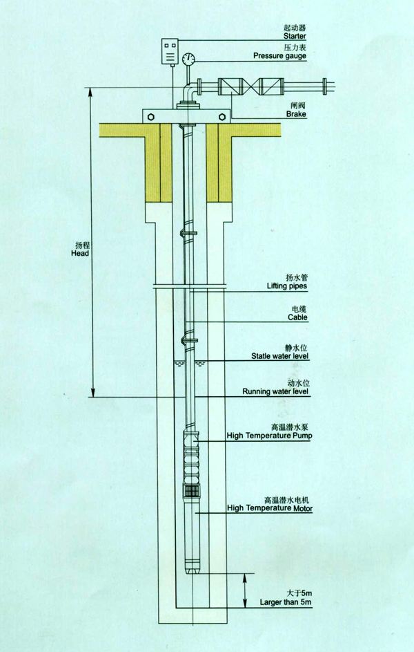 QJR系列高溫井用潛水電泵是我公司新開發(fā)的用于熱水中的立式單級(jí)、多級(jí)潛水電泵,泵與電機(jī)連為一體,潛入水中工作。該系列電泵是深井提取熱水的主要工具,適于城鄉(xiāng)、工礦企業(yè)所需熱水。該系列電泵所配YQSR系列高溫井用潛水三相異步電動(dòng)機(jī),是在引進(jìn)德國里茨公司潛水電機(jī)技術(shù)及美國雷達(dá)潛油電機(jī)技術(shù)基礎(chǔ)上自行設(shè)計(jì)制造的。它從結(jié)構(gòu)上充分考慮了汽化、鈣化和含砂的影響,從電磁和密封材料上采用了F級(jí)耐高溫有效的保證電機(jī)在高溫情況下的工作壽命。該系列電泵所配水泵,從材料和結(jié)構(gòu)上充分考慮了在熱水中使用要求。 QJR電泵:導(dǎo)殼與導(dǎo)殼為螺栓聯(lián)接,軸瓦為橡膠軸承,葉輪定位為錐套。使用條件泵進(jìn)水口至少應(yīng)浸入動(dòng)水位3m以下,電機(jī)底部距井底不少于5m,井應(yīng)正直。 a. 水溫不高于120℃。 b. 水中固體含量(按重量計(jì))不大于0.01%。 c. 水的酸堿度PH值為6.5-8.5。 d. 水中硫化物含量不大于1.5mg/L。 e. 水中氯離子含量不大于400mg/L。