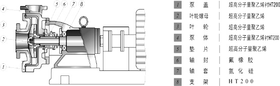 2) 泵體為鋼襯超高分子量聚乙烯結(jié)構(gòu),襯里厚度為8~20mm,該泵應(yīng)用了襯塑專利技術(shù),和其它同類泵相比較,具有襯里層抗熱變形性能好,耐開裂,防脫落,使用溫度高等優(yōu)勢。