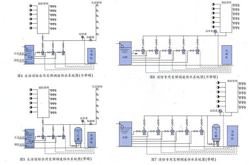 變頻供水成套設(shè)備:主泵組 變頻供水控制系統(tǒng);系統(tǒng)正常運(yùn)行時(shí),用戶用水管網(wǎng)上的壓力傳感器對(duì)用戶水壓進(jìn)行數(shù)據(jù)采樣,并將壓力信號(hào)轉(zhuǎn)換為電信號(hào),傳輸至PID調(diào)節(jié)器,然后與用戶設(shè)定的壓力值進(jìn)行比較和運(yùn)算, 并將比較和運(yùn)算的結(jié)果轉(zhuǎn)換為頻率調(diào)節(jié)信號(hào)和水泵啟動(dòng)臺(tái)數(shù)信號(hào)送至變頻器;變頻器據(jù)以調(diào)節(jié)水泵電機(jī)的電源頻率,進(jìn)而調(diào)整水泵轉(zhuǎn)速;可編程控制器根據(jù)PID調(diào)節(jié)器傳輸過(guò)來(lái)的水泵啟動(dòng)臺(tái)數(shù)信號(hào)控制水泵的運(yùn)轉(zhuǎn)。 通過(guò)對(duì)水泵的啟動(dòng)和停止臺(tái)數(shù)及其中變頻泵轉(zhuǎn)速的調(diào)節(jié),將用戶管網(wǎng)中的水壓穩(wěn)定于用戶預(yù)先設(shè)定的壓力值,使供水泵組“提升”的水量與用戶管網(wǎng)不斷變化的用水量保持一致,達(dá)到“變量恒壓供水”的目的.