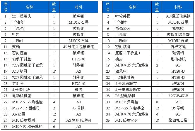 本泵與介質(zhì)接觸的零部件,系用聚乙烯醇縮丁醛改性酚醛玻璃纖維,經(jīng)高溫模壓成型的酚醛玻璃鋼制件,聯(lián)接管、出液管采用半干法卷制工藝制成的酚醛玻璃鋼管,葉輪軸套的裝配均用酚醛膠泥和泵軸粘成一體,液下各部裝配均用酚醛膠泥粘結(jié),伸入液下全無金屬與介質(zhì)接觸,耐腐性能絕對(duì)可靠,產(chǎn)品具有輕質(zhì)、高強(qiáng)、不變形、耐溫、耐腐蝕等優(yōu)良性能,在防腐方面可部分替代含鉬不銹鋼、鈦及鈦合金等貴重金屬。