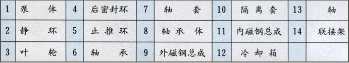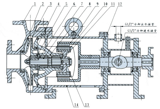 CQB-G型耐高溫磁力驅(qū)動離心泵(簡稱高溫磁力泵)通常由電機,磁力偶合器,水冷卻裝置和耐腐蝕離心泵四大部分組成,其主要特點是利用磁力偶合器傳遞動力。當電動機帶動磁力偶合器的外磁鋼旋轉(zhuǎn)時,磁力線穿過間隙和隔離套,作用于內(nèi)磁鋼上,使泵轉(zhuǎn)子與電動機同步旋轉(zhuǎn),無機械接觸地傳遞扭矩。在泵的動力輸入端,由于液體被封閉在靜止的隔離套內(nèi),沒有動密封因而無泄漏。磁力偶合器的磁性材料采用耐高溫型稀土永磁材料,能承受280度以下的高溫介質(zhì)而保持強大的磁力扭矩。在電機與磁力偶合器之間加裝了水冷卻裝置,防止泵送高溫介質(zhì)之熱量傳導至電機,以保持電機的正常運行,從而達到無泄漏輸送高溫介質(zhì)。